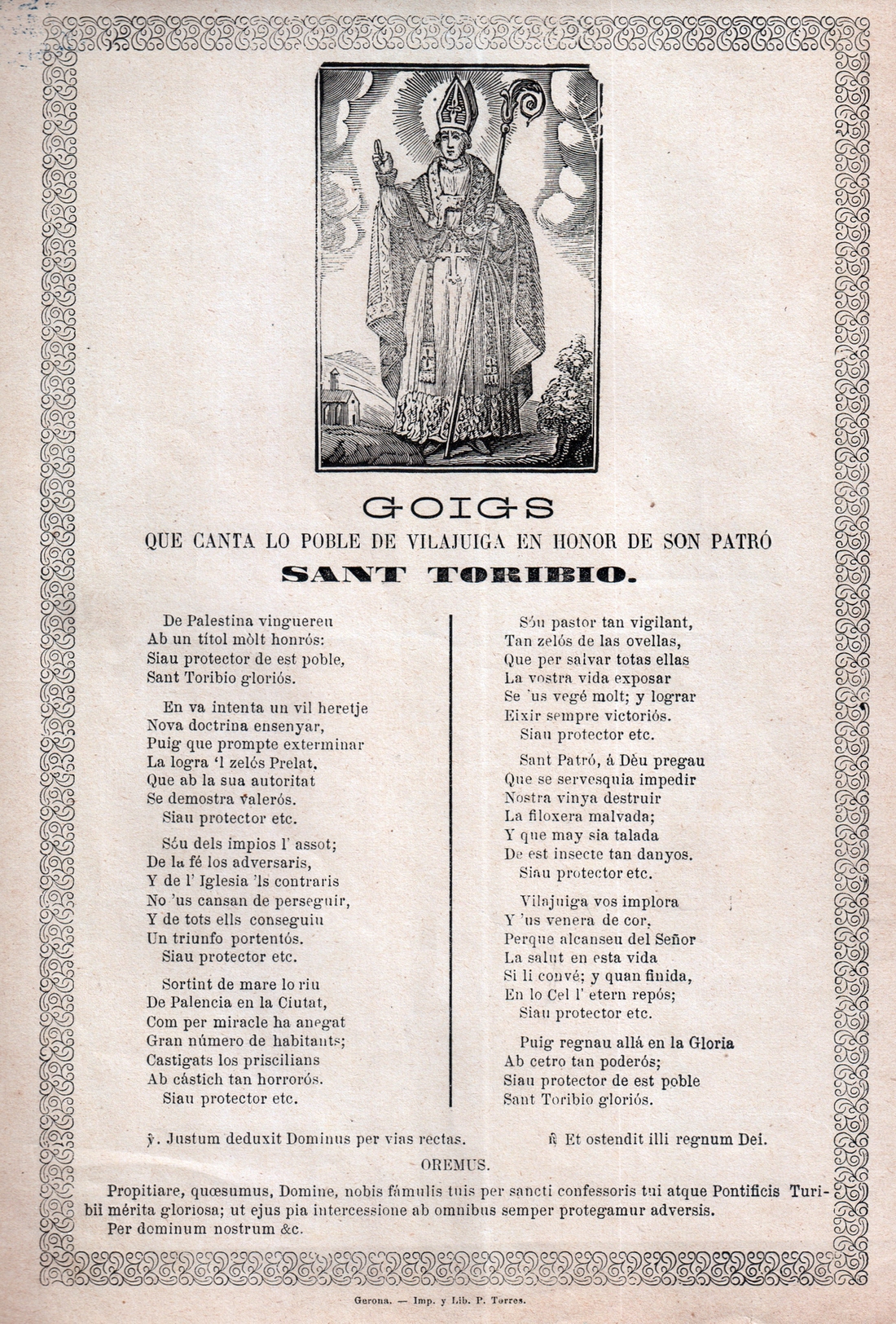 GOIGS QUE CANTA LO POBLE DE VILAJUIGA EN HONOR DE SON PATRÓ SANT TORIBIO.